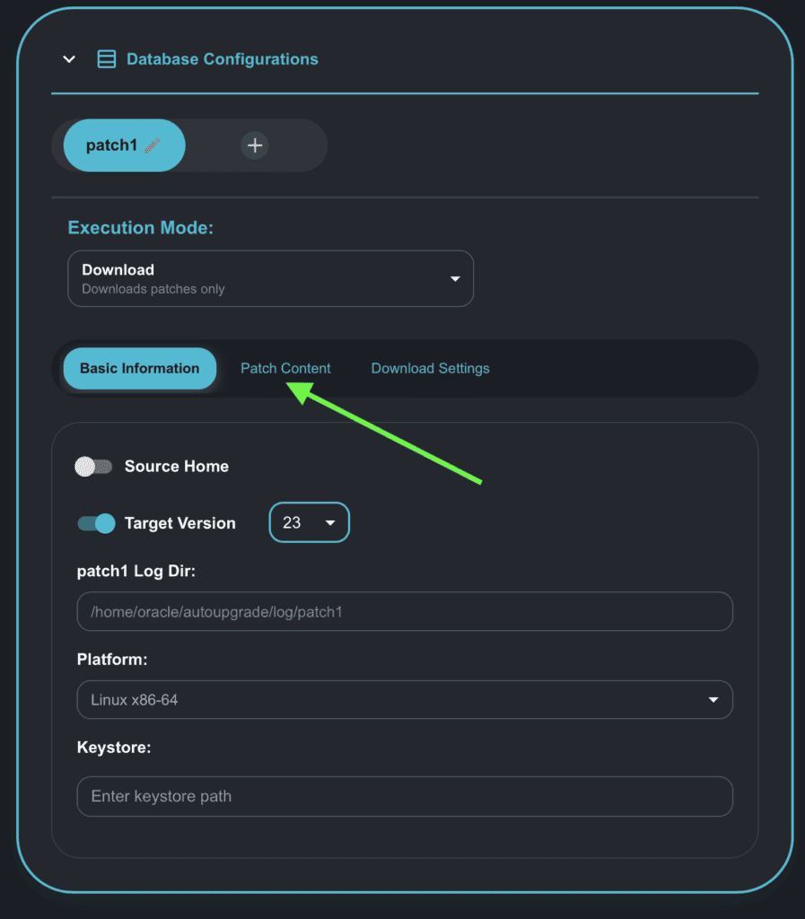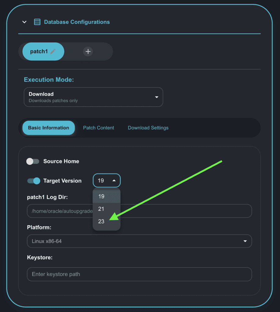 # Created by AutoUpgrade Composer # Patch, ExecMode: Download global.global_log_dir=/home/oracle/autoupgrade/log global.keystore=/home/oracle/autoupgrade/keystore patch1.log_dir=/home/oracle/autoupgrade/log/DB1 patch1.folder=/home/oracle/autoupgrade/patches patch1.patch=RU,OPATCH patch1.target_version=23 patch1.platform=LINUX.X64