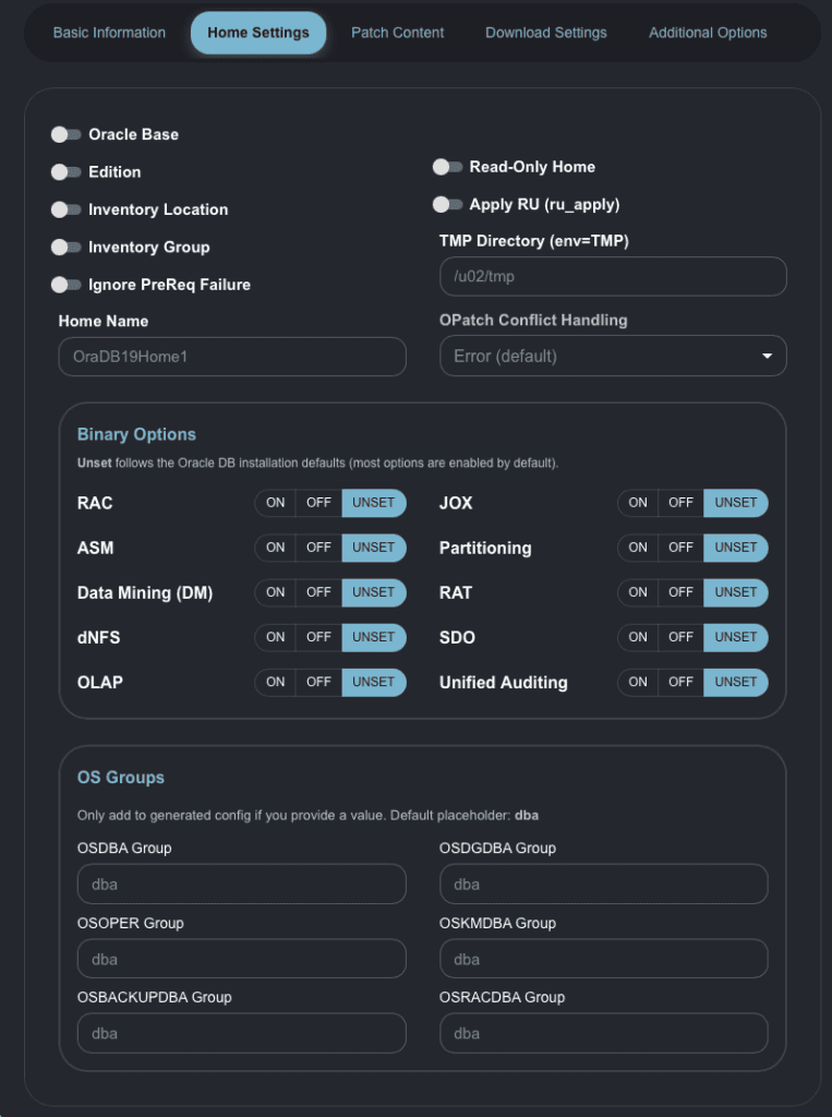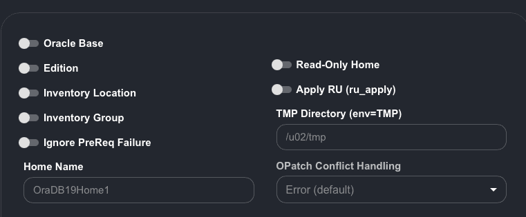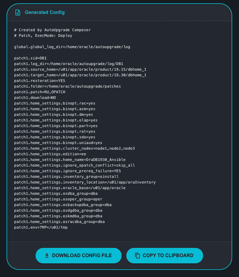 - ON: AutoUpgrade will enable the option when creating the Oracle Home. A corresponding line will be added to the generated config (right side of the screen).