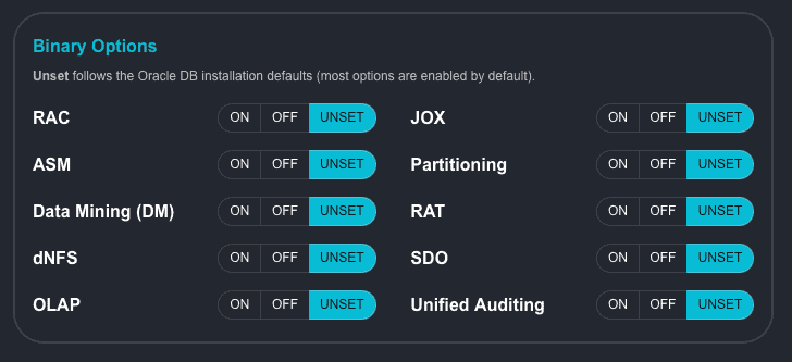 - UNSET: the default set for AutoUpgrade. When this is selected, AutoUpgrade will follow the default options for the runInstaller. For example, OLAP will be enabled (as it is enabled by default when you use runInstaller and not select to disable during the installation). No line will be added to the generated config.