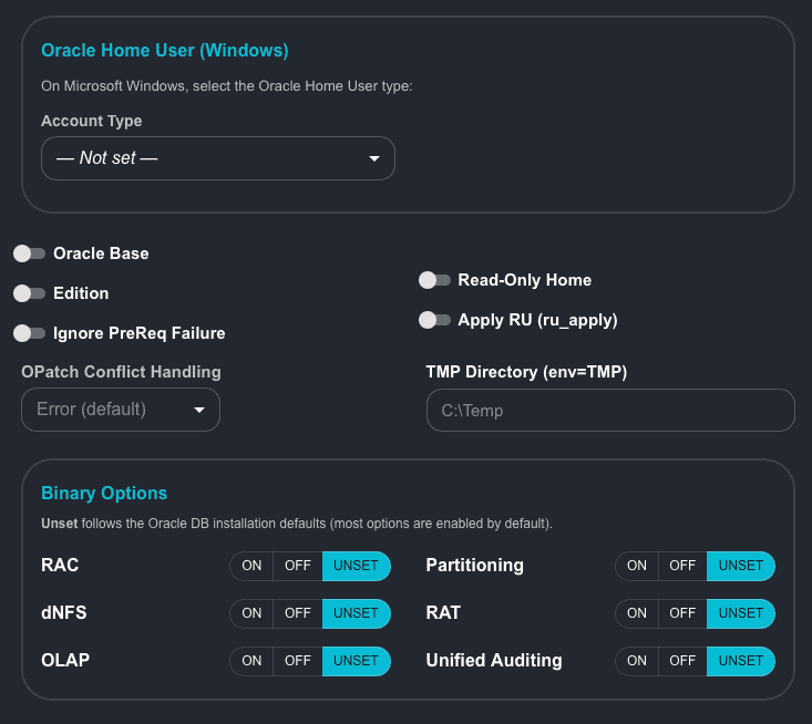 You can notice that the binary options are also reduced. This is because some of the options are not available on Windows. As we can’t change the OS groups on Windows, we don’t have the option to set the OS groups for DBA, OPER, etc.