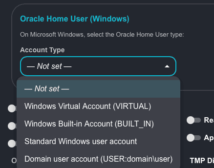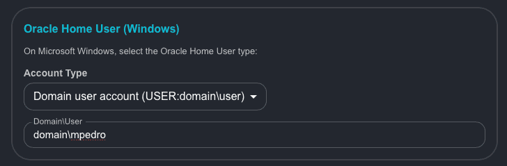 - Oracle Home User: To use this option, the Windows user account (nonadministrative user) must already exist before run AutoUpgrade. AutoUpgrade cannot create these users. On Microsoft Windows, we can choose one of the following as the Oracle Home User: