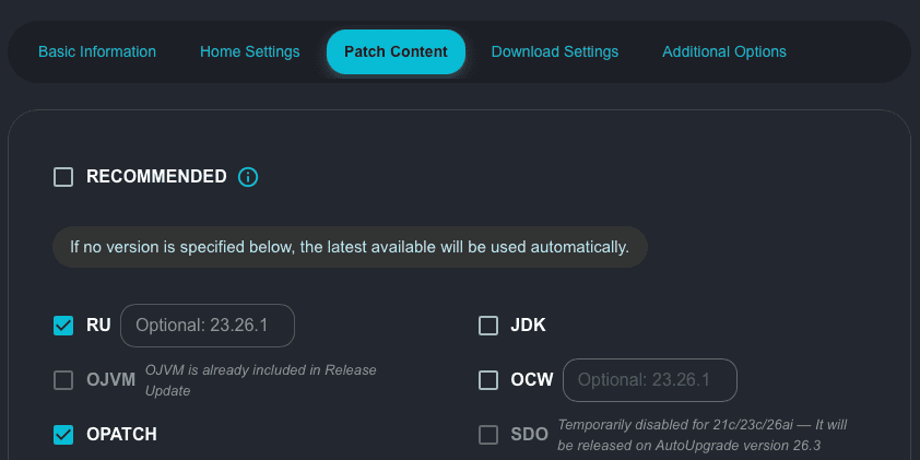 Well, this is interesting. I did several tests with 23c in the previous release updates before the release of 26ai, and AutoUpgrade was not able to find the patch for Oracle Text, failing with this message: