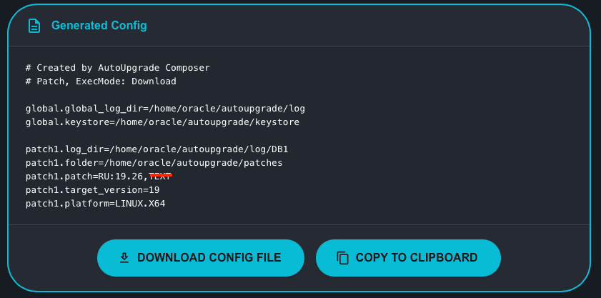 So, AutoUpgrade Composer does not have the capability (as of now – March/2026) to enable or disable the Oracle Text patch for 19c according to the RU version. You should try, and if it fails, just remove the keyword TEXT from the configuration file: