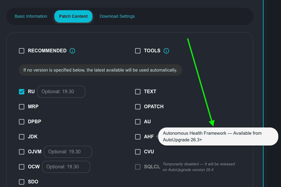 On the other hand, I will keep TOOLS in AutoUpgrade Composer. But be advised that TOOLS, AHF and CVU are only available to be downloaded through AutoUpgrade from version 26.3 onwards.