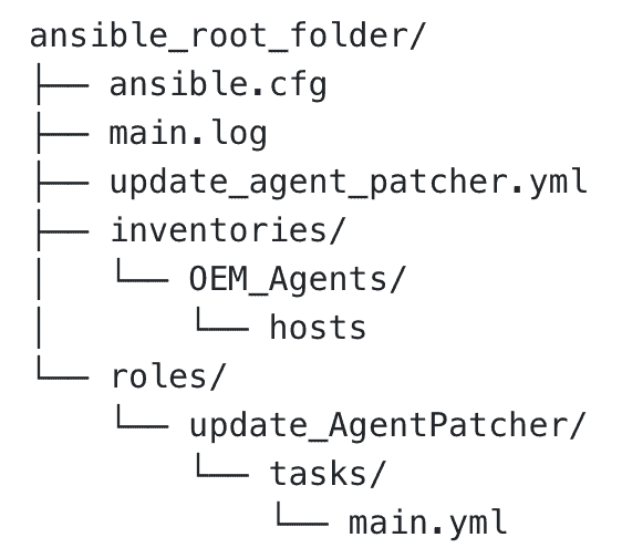 Eu não vou explicar os arquivos compartilhados abaixo em detalhes, até porque muitos são fáceis de serem compreendidos. Os arquivos ansible.cfg e update_agent_patcher.yml possuem alguns parâmetros necessários para o funcionamento do Ansible, eu te encorajo a ler a documentação do Ansible para maiores detalhes. Será um prazer te ajudar caso tenha alguma dúvida, mas por favor, tenha em mente que eu não sou um grant expert em Ansible!