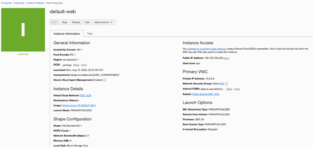 A Instance criada será exibida: