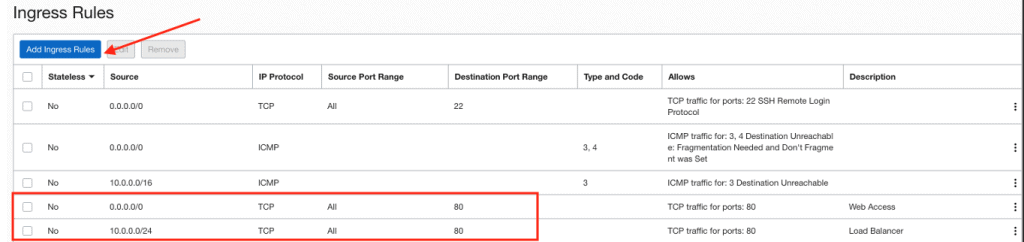 Clique no botão Add Ingress Rules, as duas regras que deverão ser criadas estão destacadas pelo retângulo vermelho: