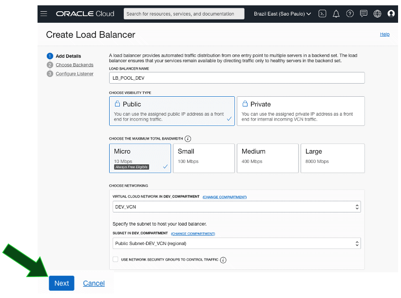 Especifique um nome para o Load Balancer (LB_POOL_DEV), mantenha o tipo de visibilidade em Public e o shape em Micro. Escolha a VCN recém-criada, DEV_VCN e escolha a Subnet Pública, então clique em Next: