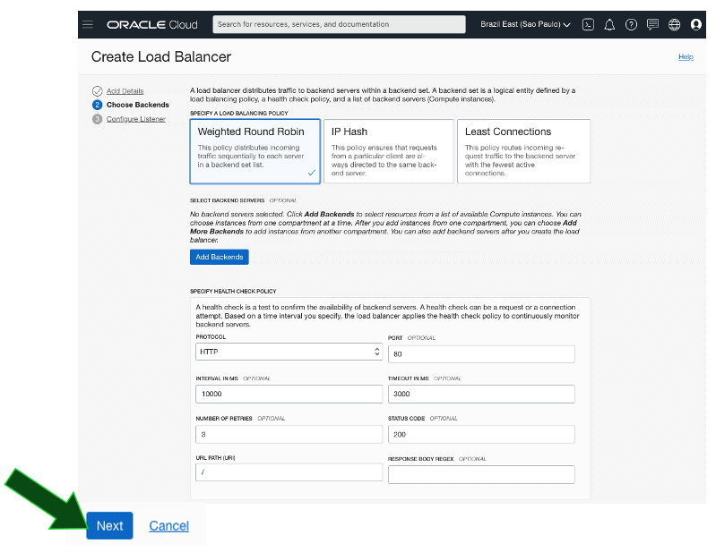 Na política de Load Balancing, mantenha a opção Weighted Round Robin, especifique o protocolo HTTP e porta 80, clique em Next:
