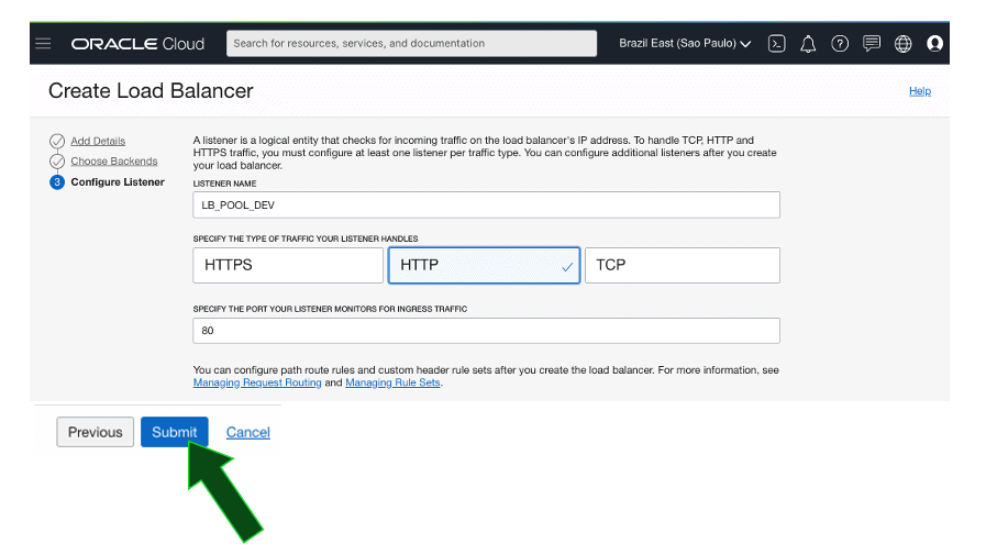 No listener, especifique o nome LB_POOL_DEV, escolha o protocolo HTTP e a porta 80, clique então em Submit: