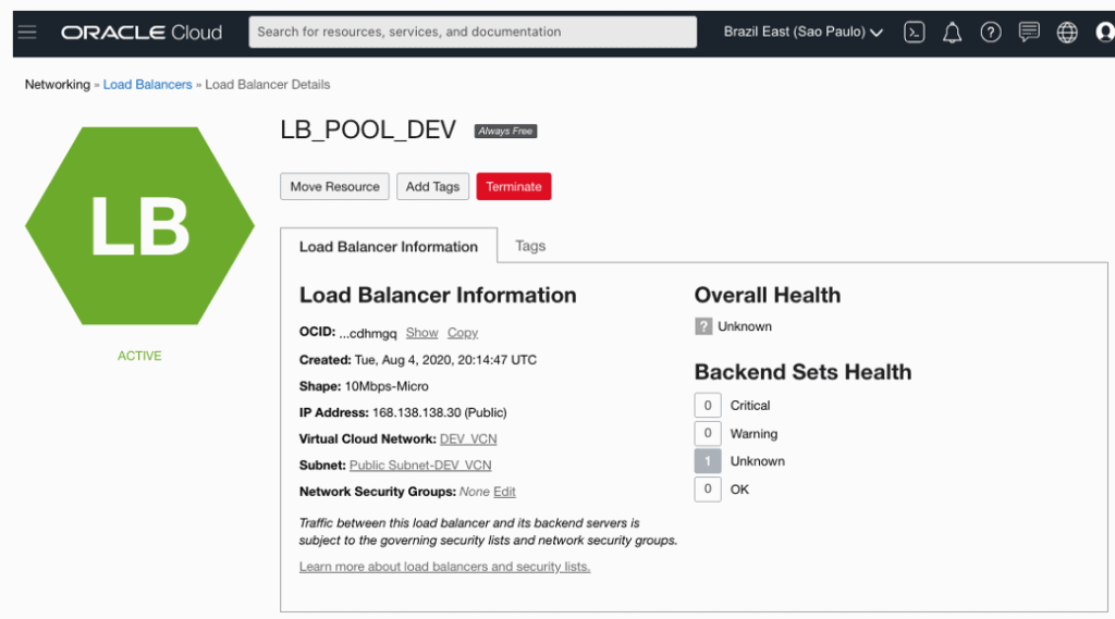 O Load Balancer será criado: