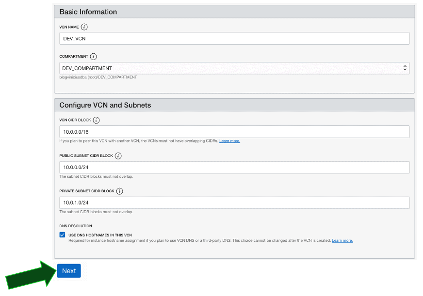 Especifique um nome para a VCN, no exemplo usamos DEV_VCN, escolha o compartment recém criado, revise dados de CIDR Block e clique em Next:
