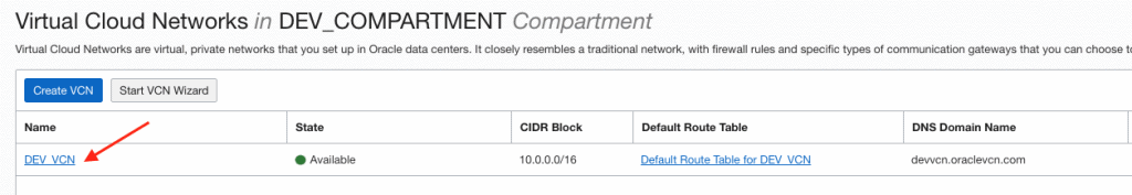 Clique na VCN DEV_VCN: