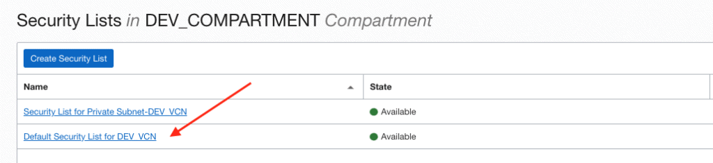 Clique então em Default Security List for DEV VCN:
