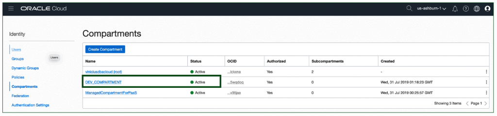 Os compartments serão exibidos. Agora há um compartment chamado DEV_COMPARTMENT: