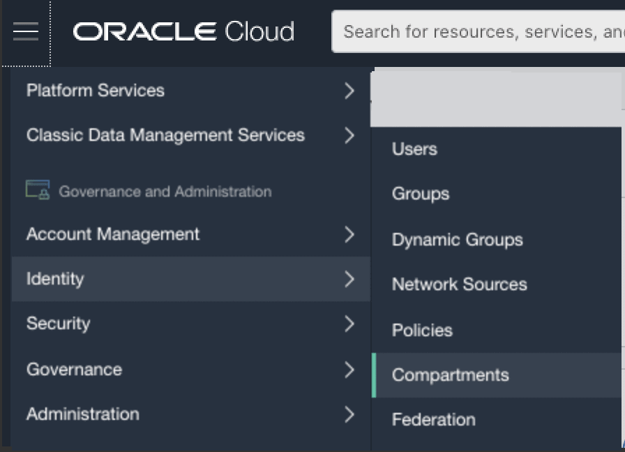Portanto, na tela inicial, clique no “hambúrguer” e então vá até Identity e depois clique em Compartments: