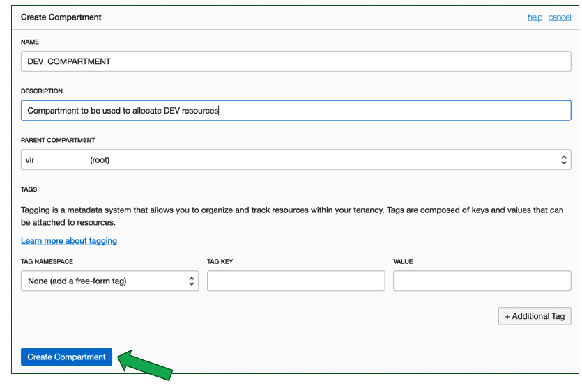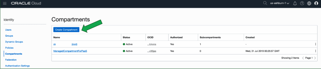 Os compartments existentes aparecerão. Clique no botão Create Compartment: