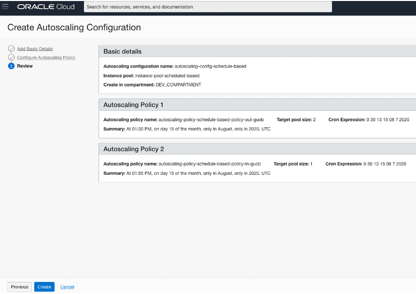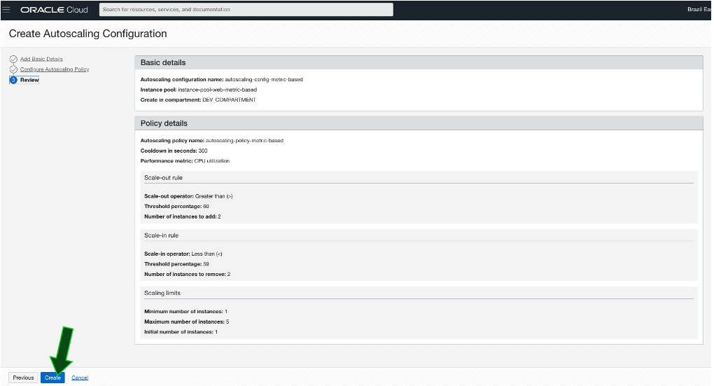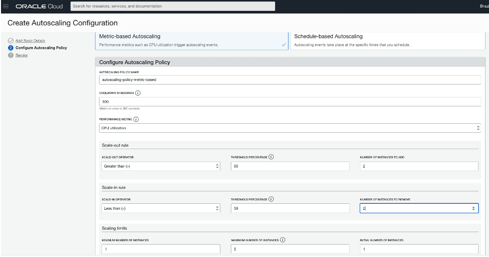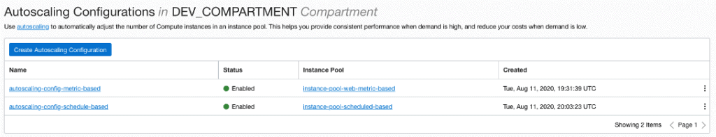 Com as Instance Pools criadas, uma para metric-based e outra para schedule-based, agora é o momento de criar as AutoScaling Configurations, uma para metric-based utilizando a Instance Pool metric-based e outra para schedule-based utilizando a Instance Pool schedule-based: