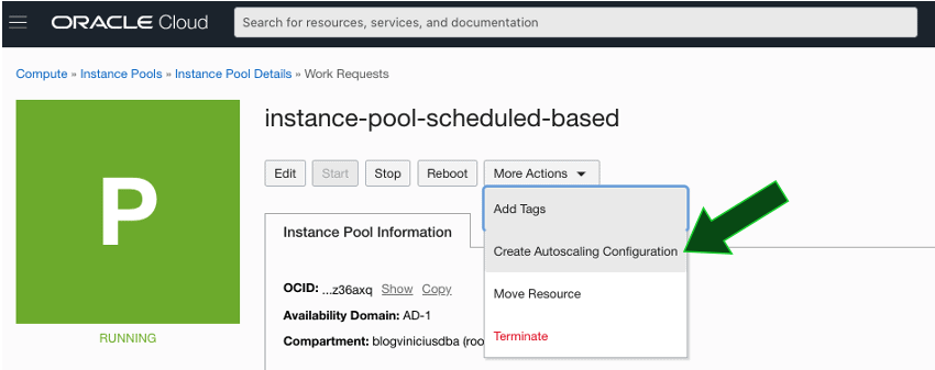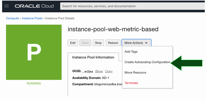 Dentro da tela do Instance Pool instance-pool-web-metric-based, clique em More Actions e então clique em Create Autoscaling Configuration:
