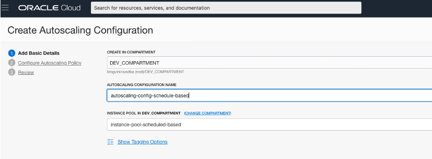 Selecione o compartment DEV_COMPARTMENT e defina um nome para a configuração de autoscaling, no exemplo utilizei autoscaling-config-schedule-based. Clique em Next: