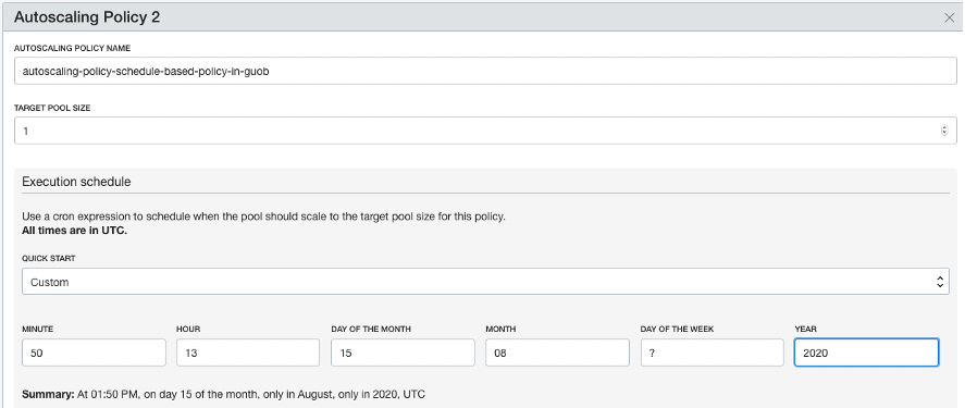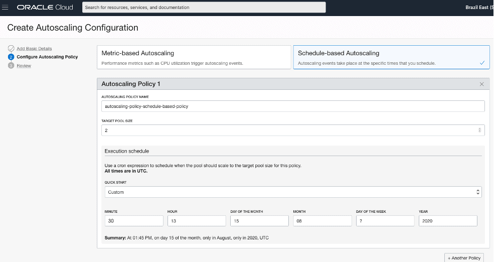 Na tela abaixo, selecione que a configuração de autoscaling será Schedule-based Autoscaling. Então defina um nome para a política de autoscaling, no exemplo usei autoscaling-policy-schedule-based-policy. Em Target Pool Size defina o número desejado de instâncias no Pool quando a política for executada, neste caso como estamos aumentando o Pool de 1 para 2 instâncias, o Target Pool Size foi definido como 2. No Execution Schedule, defina quando deseja executar a política. Neste exemplo eu utilizei uma política customizada que seria executada no dia 15 do mês 08 do ano de 2020 às 13 horas e 30 minutos. Cliquei então em + Another Policy para adicionar outra política: