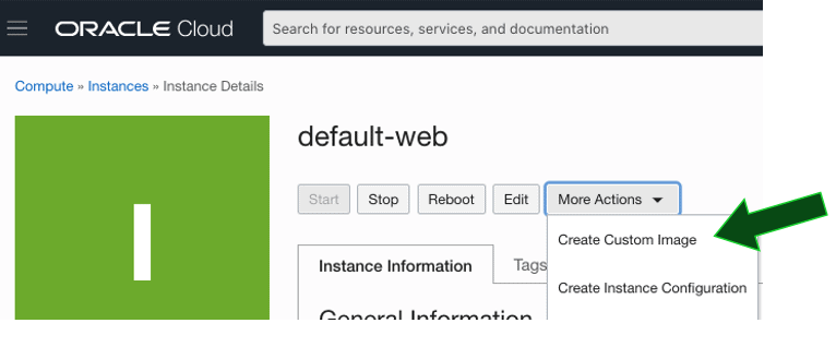 Dentro da página da instância, clique em More Actions e em seguida clique em Create Custom Image: