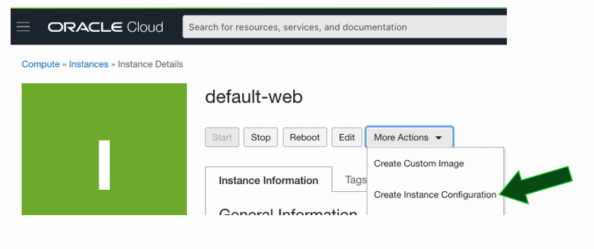 Portanto, com a Instância criada no passo anterior e dentro da página da instância, clique em More Actions e em seguida em Create Instance Configuration: