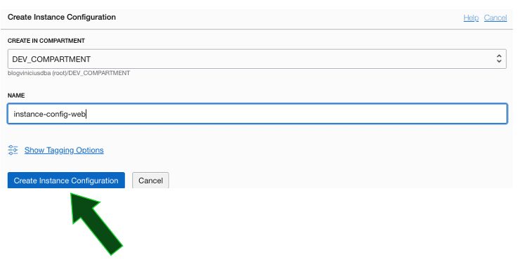 Selecione o compartment DEV_COMPARTMENT e defina um nome para a Instance Configuration. No exemplo utilizei instance-config-web: