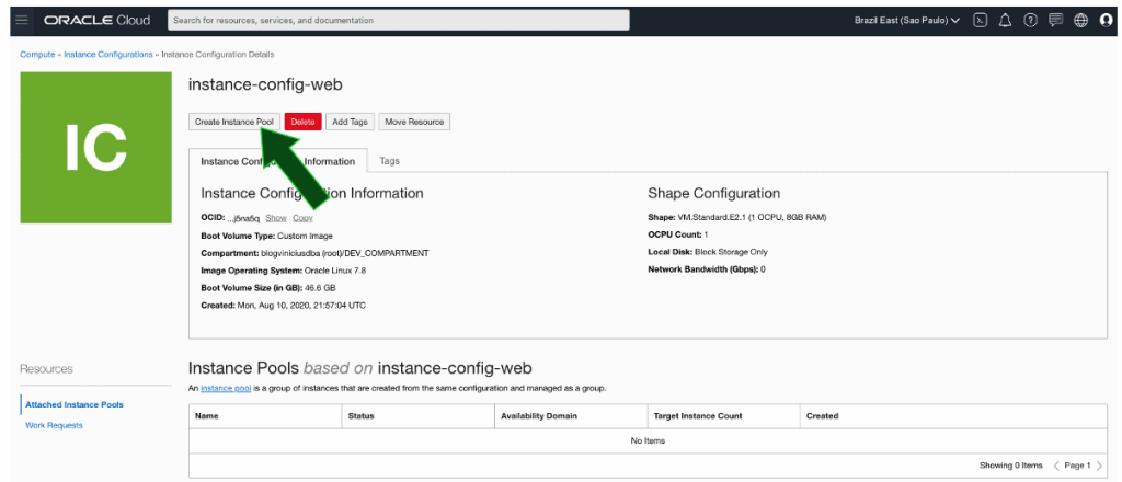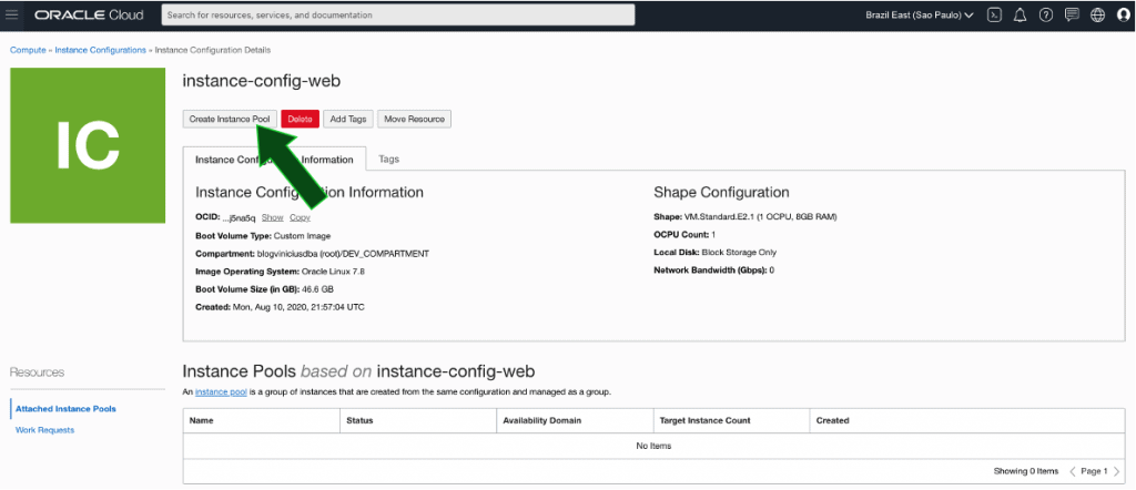 Dentro da tela da Instance Configuration criada anteriormente, clique em Create Instance Pool: