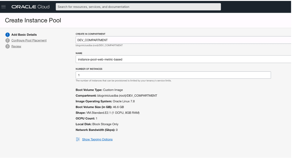 Escolha o compartment DEV_COMPARTMENT e defina um nome, no exemplo o nome utilizado foi instance-pool-web-metric-based. Defina o número de instâncias também. Observe que o pode-se iniciar o pool com apenas 1 instância. Neste caso, o ideal é que você inicie o pool com a quantidade de instâncias para atender o seu workload. Como este é apenas um exemplo, iniciar o pool com 1 instância é suficiente: