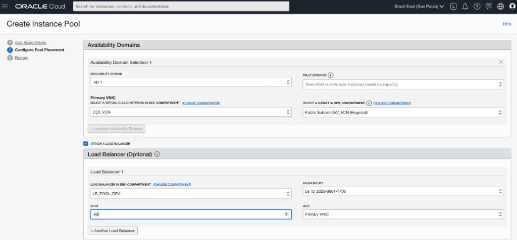 Especifique em quais AD’s, FD’s (opcional), VCN e Subnet as instâncias precisam ser criadas. Observe que para regiões que possuam apenas um AD, não há opção para adicionar outros, o botão fica desativado. Observe que há a opção para attachar a instância ao Load Balancer. Escolha o Load Balancer criado no pos anterior e defina a porta 80: