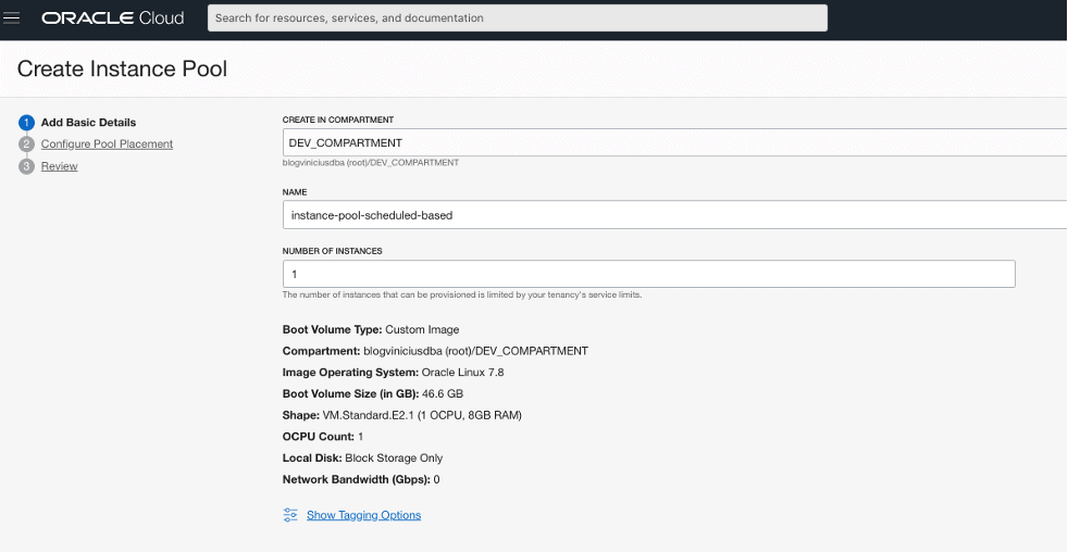 Escolha o compartment DEV_COMPARTMENT e defina um nome, no exemplo o nome utilizado foi instance-pool-web-schedule-based. Defina o número de instâncias também. Observe que o pode-se iniciar o pool com apenas 1 instância. Neste caso, o ideal é que você inicie o pool com a quantidade de instâncias para atender o seu workload. Como este é apenas um exemplo, iniciar o pool com 1 instância é suficiente: