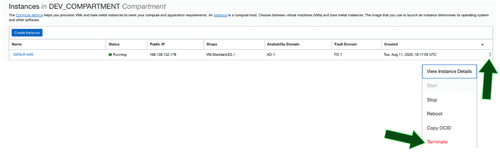 Dentro da página Instances, clique nos três pontos no canto direito da imagem e em seguida clique em Terminate: