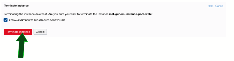 Em seguida, selecione a opção Permanently delete the attached boot volume e então clique no botão Terminate Instance: