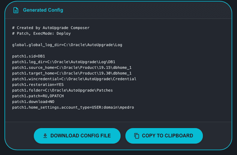 - ON: AutoUpgrade will enable the option when creating the Oracle Home. A corresponding line will be added to the generated config (right side of the screen).