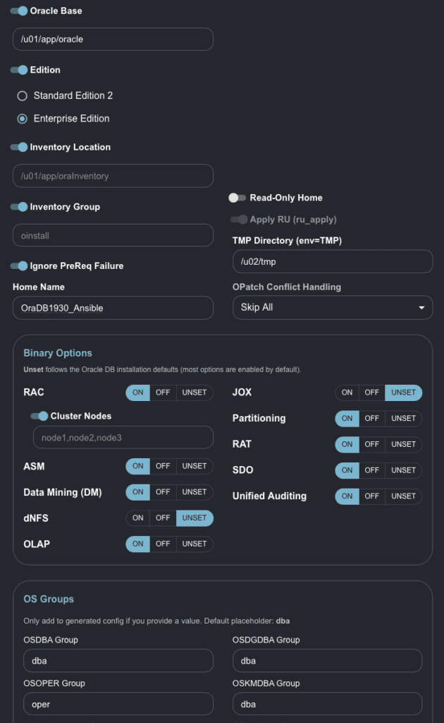 - UNSET: the default set for AutoUpgrade. When this is selected, AutoUpgrade will follow the default options for the runInstaller. For example, OLAP will be enabled (as it is enabled by default when you use runInstaller and not select to disable during the installation). No line will be added to the generated config.