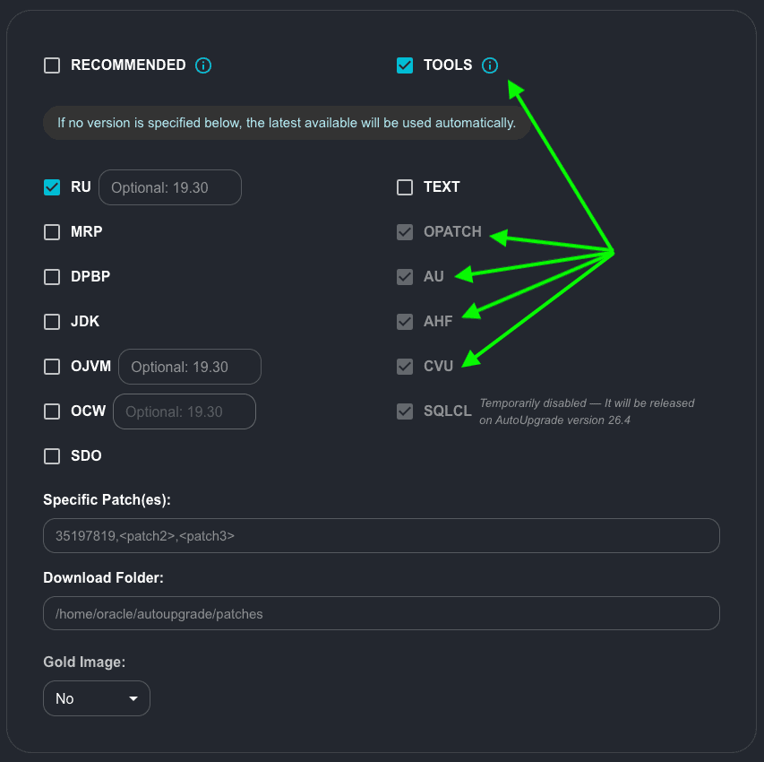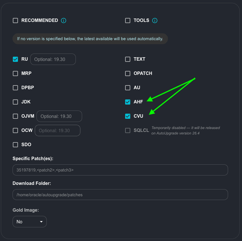 If you notice, now we have the checkboxes for TOOLS, AHF, CVU and SQLCL