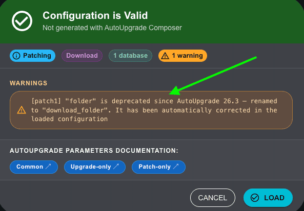 Now in AutoUpgrade 26.3, the parameter FOLDER is deprecated. You will need to use the new parameter DOWNLOAD_FOLDER. AutoUpgrade still will work with FOLDER, but it’s good to start fixing your configuration files! 🙂