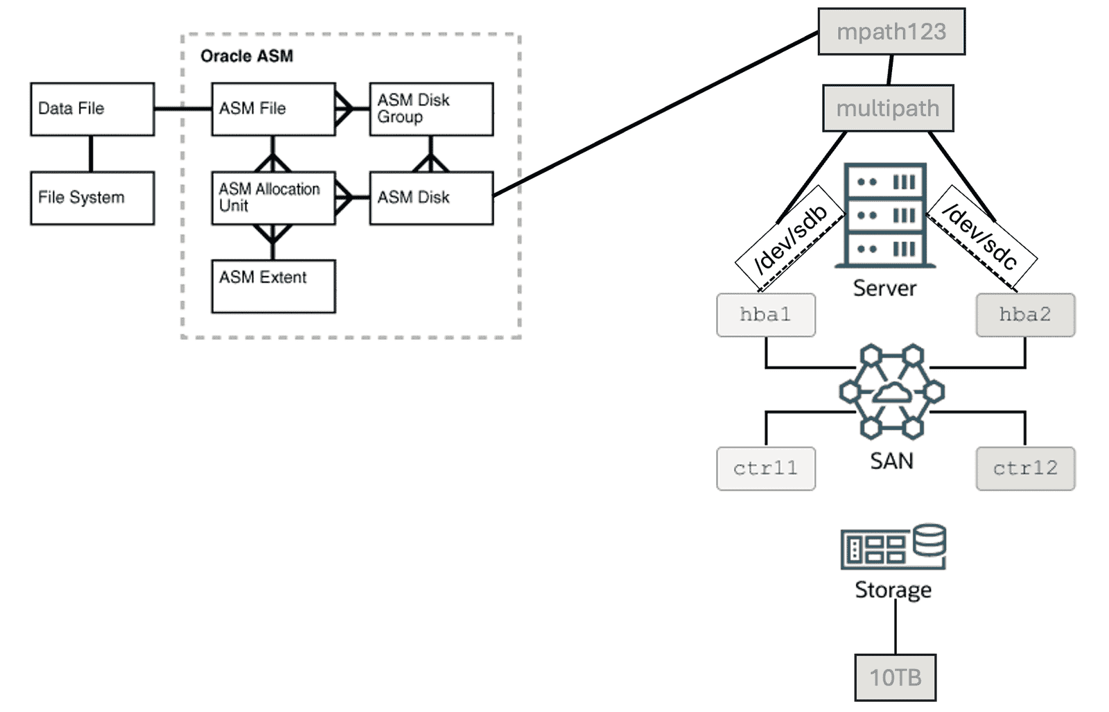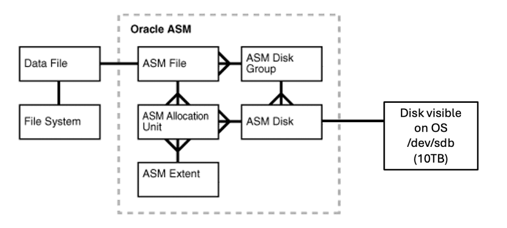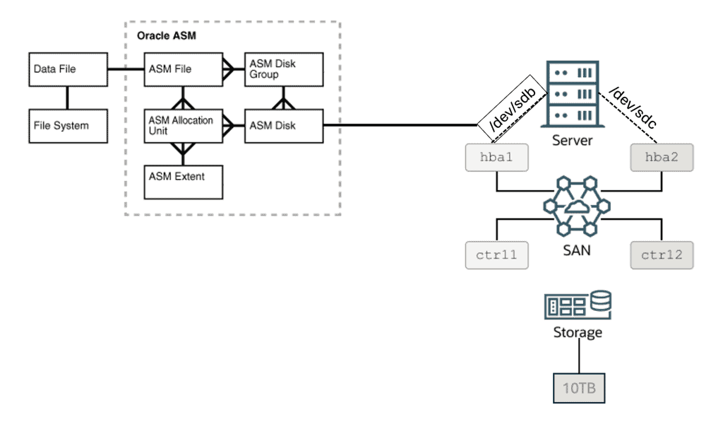Portanto, na figura acima, você tem um disco ASM, que é visível no sistema operacional como /dev/sdb e possui 10TB de capacidade. OK, agora imagine que o disco exibido como /dev/sdb não é um disco local anexado/attachado ao servidor. Ao invés disso, é um disco que vem do storage.