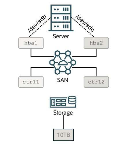 Isso significa que uma única LUN de 10TB pode ser reconhecida como “dois (ou mais) diferentes discos” à partir do Linux. Portanto, nossa LUN de 10TB pode ser reconhecida como /dev/sdb e /dev/sdc no sistema operacional. Cada “disco” reconhecido no sistema operacional, nós chamamos de “path”. Vamos olhar a imagem abaixo: