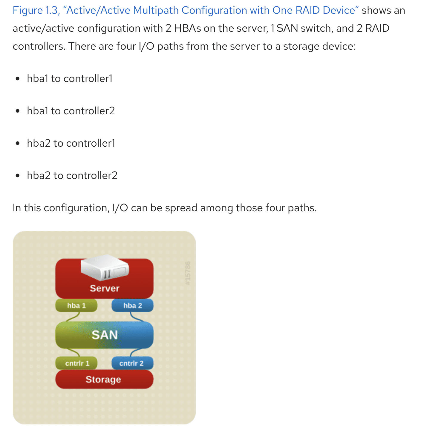 Um storage também pode ter mais de um storage controller (para fins de redundância). Vamos imaginar que nosso storage possui dois storage controllers. Vamos também imaginar que nosso servidor de BD possui duas HBAs (Host Bus Adapter). HBA é um componente de hardware usado em ambientes SAN para conectar servidores à dispositivos de storage, como por exemplo, arrays de disco. Geralmente, um servidor de BD possui múltiplos HBAs, novamente, para redundância.