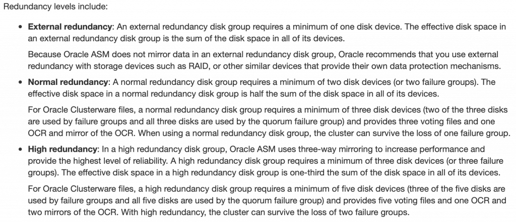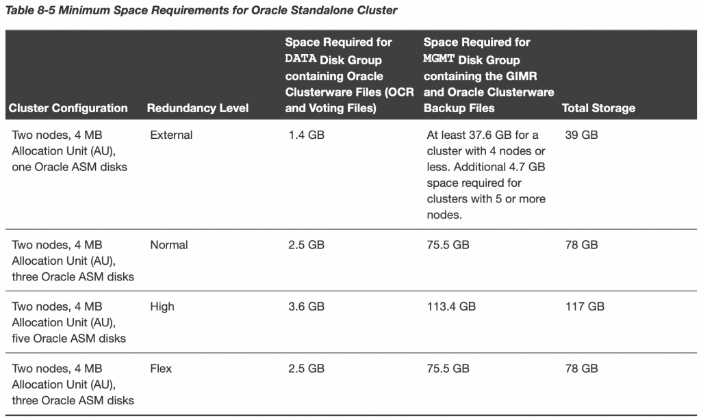 - https://docs.oracle.com/en/database/oracle/oracle-database/12.2/cwlin/oracle-clusterware-storage-space-requirements.html#GUID-97FD5D40-A65B-4575-AD12-06C491AF3F41