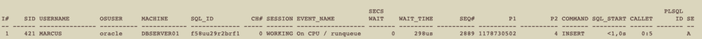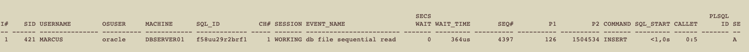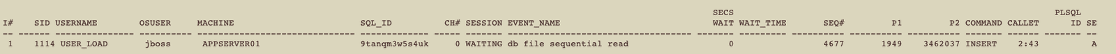 As we can see, we have an INSERT statement waiting on ‘db file sequential read’. The LAST_CALL_ET column shows that INSERT was running for almost 3 minutes.