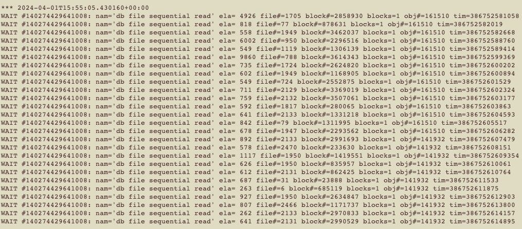 As first thing, I verified the waiting sessions on DB and found that the user was waiting on ‘db file sequential read’ wait event for their INSERT statement (info obfuscated for security reasons):